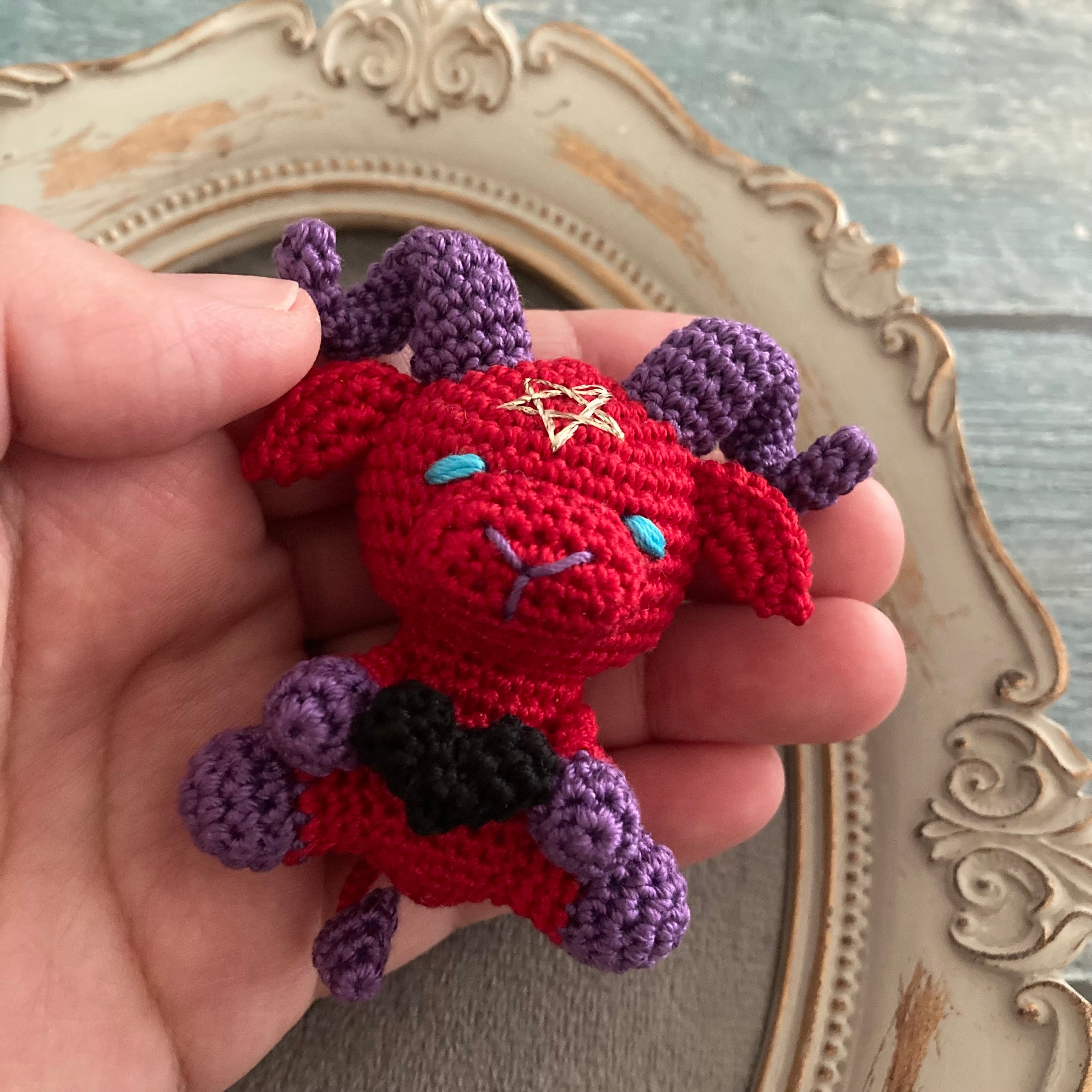 レース糸で編みあげた小さなサイズのデーモンです。 ピエロだらけの召喚会に出現したサーカス団員のデーモンのようです。 襟飾りで華やかな装いをしています。 ブラックボディにショッキングピンクの角を持った悪魔らしさ全開のデーモンがやってまいりました。 召喚の際、贄を必要とする非常に危険なデーモンとなっております。 バフォメットをモチーフにしたヤギのような見た目で、額に逆五芒星をあしらいました。 お座りスタイルの邪悪で恐ろしいあみぐるみです。 手乗りサイズな禍々しい悪魔を召喚しませんか? ■サイズ: 縦約6.5cm 横約6cm ■素材:オリムパスエミーグランデ綿100%レース糸、ポリエステル100%綿、アルミニウムワイヤー、コットン ■その他、注意事項: 丁寧に製作しておりますが手編みハンドメイド作品のため多少の歪みはございます。 編み物作品は伸び縮みしますので、サイズの誤差が生じる可能性がございます。 編み目の隙間から綿が見えることがございます。 お子様の玩具としてはお作りしておりません。お子様が触れない場所などに保管・ディスプレイをお願いいたします。 背景のお花や小物は商品に含みません。 色はなるべく実物に近づけておりますが、画面上とは違って見える場合がございます。 梱包はどのサイズの魔物でも全てダンボールにお入れした統一した形での発送となります。 注意事項をご理解ご了承の上ご購入お待ちしております。