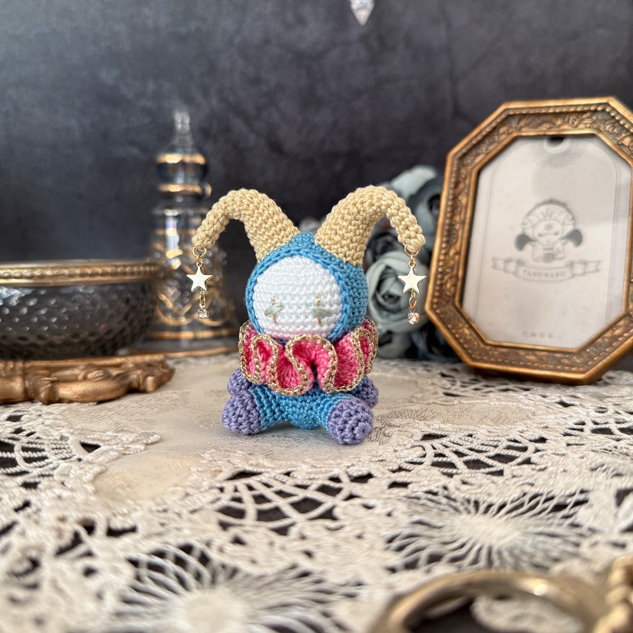 どこか不穏な雰囲気を感じさせるピエロのあみぐるみです。